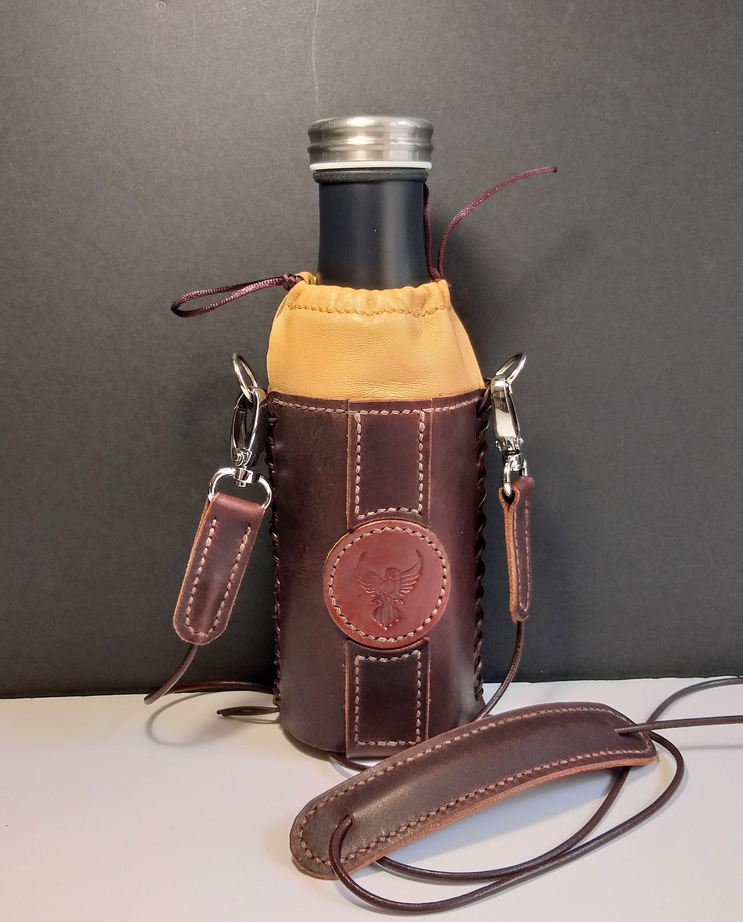 This designer custom leather bottle holder is handcrafted from high quality leather, making it extremely durable.